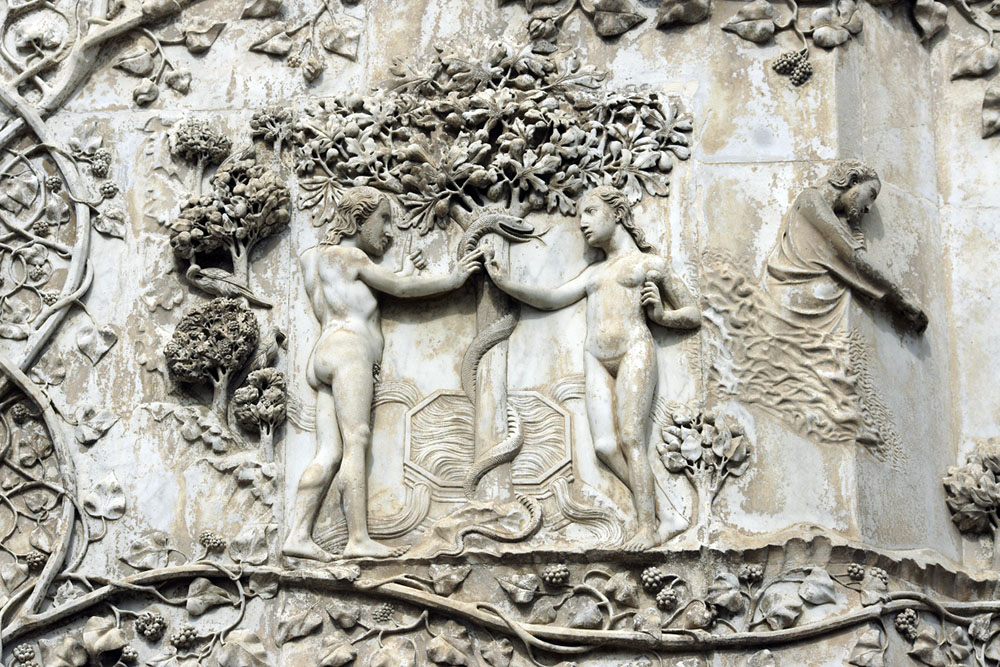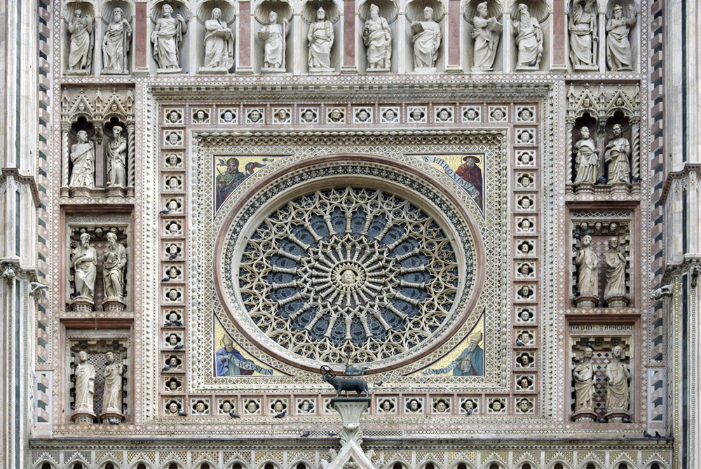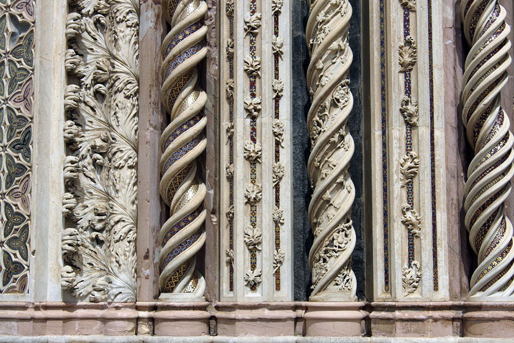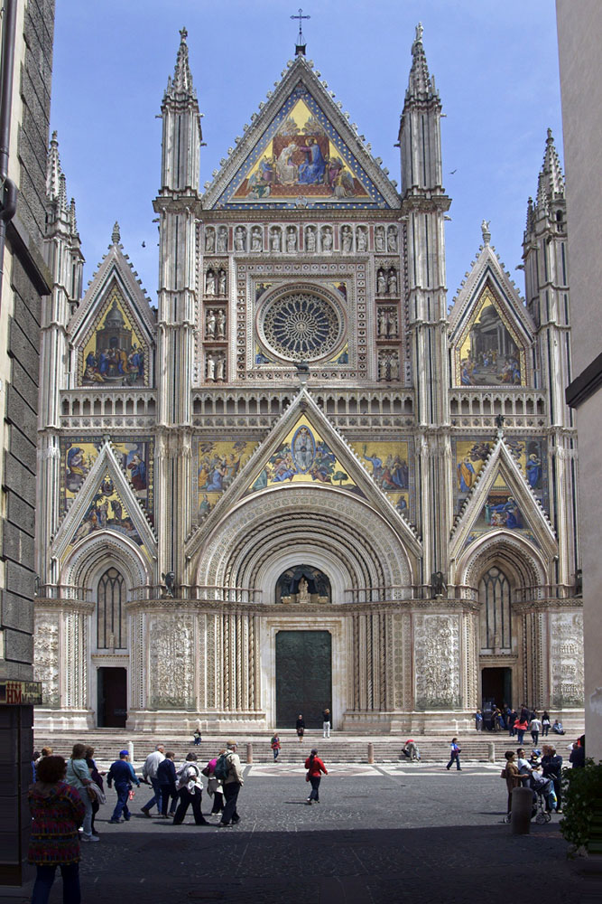 Zaiste budowla jest godna. Ma 100 metrów długości, 40 szerokości, a fasada ma 55 metrów wysokości. Jesteśmy we Włoszech, to są tutejsze proporcje. Potęga katedry wymyka się pojęciu,podobnie jak ów cud. Przytłacza, zachwyca, wreszcie wzrusza. Imponująca fasada magnetycznie przyciąga, nie można się od niej uwolnić, jest jak wyhaftowana w marmurze, hipnotyzuje i wciąga w treści. jesteśmy jak średniowieczni pielgrzymi nanalfabeci, którym fasada jak wielka księga snuje opowieści o grzechu i o zbawieniu. Aby to umbryjskie arcydzieło włoskiego gotyku mogło powstać, zburzono aż dwa kościoły. Architektów tego kamiennego sukcesu było kilku, wśród nich dwa najsłynniejsze nazwiska Arnolfo di Cambio,budowniczego florenckiej katedry, a także Lorenzo Maitani ze Sieny, autor florenckiego Palazzo Vecchio. Budowa katedry trwała 300 lat. Jej imponującą zewnętrzną fasadę z trzema portalami zdobią: rozeta otoczona postaciami świętych i płaskorzeźbione sceny biblijne. Ta „biblia pauperum” przenosi wzrok patrzących w odległe czasoprzestrzenie biblijnych historii, zrozumiałe niemal dla wszystkich. Bardzo lubię wracać do opisu Orvieta, autorstwa Herberta – wprawne oko miłośnika sztuki przekłada swój zachwyt na maestrię słowa i dopełnia je dowcipem. „Fasada była dla Włochów kolorową procesją nieco przesadną jak opera z chórami rzeźb, mozaik, pilastrów i wieżyczek, a Orvieto jest na pewno jednym z najbardziej uderzających przykładów malarskiej koncepcji architektury. To właśnie sprawia trudną do oddania mieszaninę zachwytu, zażenowania i zupełnego zagubienia w lesie kolorowych kamyków, falujących płaszczyzn brązu, złota i błękitu.”