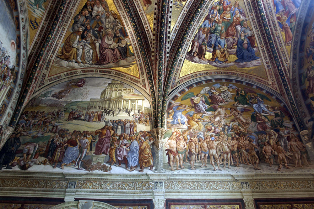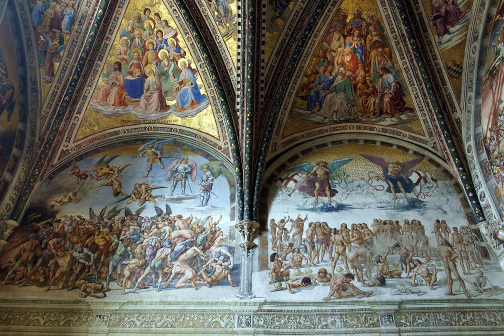 W rok zatem, powstało dzieło, będące w części kontynuacją pracy wielkiego malarza Fra Angelico i w części absolutnie będące niezależnym dziełem wyobraźni wielkiego Luki. Słynny „Sąd Ostateczny” składa się z cyklu siedmiu fresków. Ściany górnej części kaplicy szczelnie pokryte są malowidłem niezwykle ekspresyjnym, wręcz groteskowym pełnym powyginanych ludzkich ciał, dynamicznym, świadczącym o fascynacji autora anatomią i wyglądem człowieka. Wśród przedstawionych postaci znajdują się słynne twarze będące bohaterami gorących wydarzeń politycznych ówczesnych czasów – fałszywym prorokiem jest, więc największy z wrogów Medyceuszów – florenckich mecenasów Signorelliego – Girolamo Savonarola. Ten płomienny kaznodzieja, reformator, dominikanin, schizmatyk, wytykający kościołowi moralne zepsucie i w związku z tym uznanym za heretyka, skonfliktowany był także z ówczesnym papieżem. Był zatem torturowany, powieszony, a następnie spalony na stosie. Na fresku ucieleśnia więc Antychrysta. Ale nie tylko jego, Signorelli uwiecznił na ścianach kaplicy. Sportretował siebie (w kapeluszu) Fra Angelico i wiele znanych postaci swoich czasów: Petrarkę, Rafaela, Dantego, Kolumba, czy Bocaccia. O tym „Sądzie Ostatecznym” mówi się, że wręcz kunsztem przewyższa ten watykański, autorstwa Michała Anioła. Bez wątpienia ten wielki Toskańczyk wzorował się na starszym koledze – Signorellim, gdy 40 lat po nim malował dzieło swego życia w Kaplicy Sykstyńskiej. Dół kaplicy zdobią między innymi motywy roślinne, a także wizerunki poetów filozofów i ilustracjami do ich dzieł w tym do „Boskiej komedii”Dantego.
