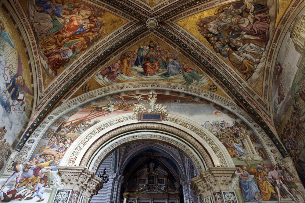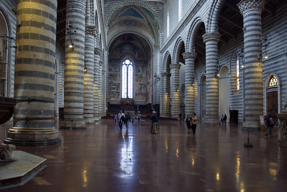 Wnętrze katedry Santa Maria Assunta wykonane z pasów czarno-białego marmuru (tak jak katedra w Sienie) ozdobiły najgorętsze nazwiska włoskiego quattrocenta. Słynni artyści pracowali przed wszystkim nad zdobieniem najpiękniejszej kaplicy katedry – XV-wiecznej Madonna di San Brizio. Stąd wszyscy zwiedzający najpierw tu kierują swe krok,i by w oniemieniu, przerażeniu i zachwycie pomieszanym z pewnego rodzaju zdziwieniem podziwiać sceny „Sądu Ostatecznego”. Na początku zdobił ją freskami sam Fra Angelico, odwołany wkrótce przez papieża Mikołaja do Rzymu, gdzie pilniej potrzebny był jego talent. Kolejny wybór padł na Perugina i Antonia Viterbo, ale skończyło się na innym wielkim nazwisku włoskiego renesansu – Luce Signorellim uczniu Piero della Francesca. Ponoć okazał się wykonawcą tańszym, szybkim i jednocześnie znakomitym. Tak, wiem to było dawno…