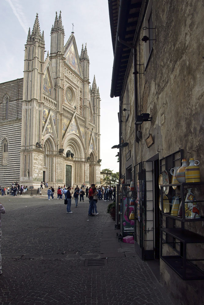 Budowli nie widać z dołu, nawet z wagonika funicolare, która wiezie przybyszów na umbryjską górę, na której rozsiadło się miasteczko, nie widać. A jedzie się tam właśnie dla niej. I gdy już ją zobaczysz, to długo Cię ten widok nie opuści. Nie pamiętam budowli z równą mocą rozdzierającej przestrzeń wokół siebie, niż właśnie katedra w Orvieto. Ten włoski, tak swoisty gotyk płomienisty, obłożony złotem, malachitem i maestrią zdobień przyprawia o bezdech i zawrót głowy. Katedra wypełnia plac wzdłuż, wszerz i na boki, zdaje się nie mieć końca i dźgać niebo ostrzami fasady. Jest wszechobecna, jej ciężar, majestat, jej cienie ścigają przybysza w każdym zakątku miasta. Słusznie pisał Herbert o jej nieustającej obecności, o niemożności pojęcia jej potęgi, o kunszcie budowniczych. Dlaczego wędrujemy do Orvieto?