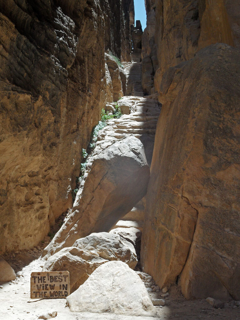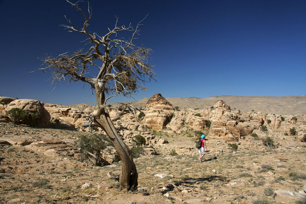 Z niedowierzaniem natykamy się raz, po raz na zagubionych handlarzy pamiątkami, zastygłych w oczekiwaniu i zadumie sprzedawców herbaty. Jest ich kilku i nie są nachalni, stopili się z tym miejscem, jego spokojem i trwaniem w czasie. Są jak duchy tych, którzy kiedyś tu żyli, choć nie są Nabatejczykami, a w większości Beduinami, którzy swoje pustynne życie przeplatają tym osiadłym. Dziś z samej pustyni już nie da się żyć. Warto przejść cały „Zimny Wąwóz”, udać się aż do końca, wdrapać się na skały, na dach miasta, aby spojrzeć na, jak głosi tekturowa kartka, „the best view in the world”. Idziemy w ten „the best”. Fakt, widok jest olśniewający. Patrzymy w oko pustyni. Karłowate, wyschnięte drzewa trzymają się tu kurczowo niedawnego życia, wspominają i zaświadczają, że kiedyś było i że może kiedyś wróci. Nie ośmielamy się przekroczyć granicy piasku. Nie jesteśmy stąd, przestrzeń i jej reguły pożarłyby nas w mig. Stajemy pokorni i onieśmieleni wobec potęgi przyrody i inności wszystkiego, co do tej pory widzieliśmy.