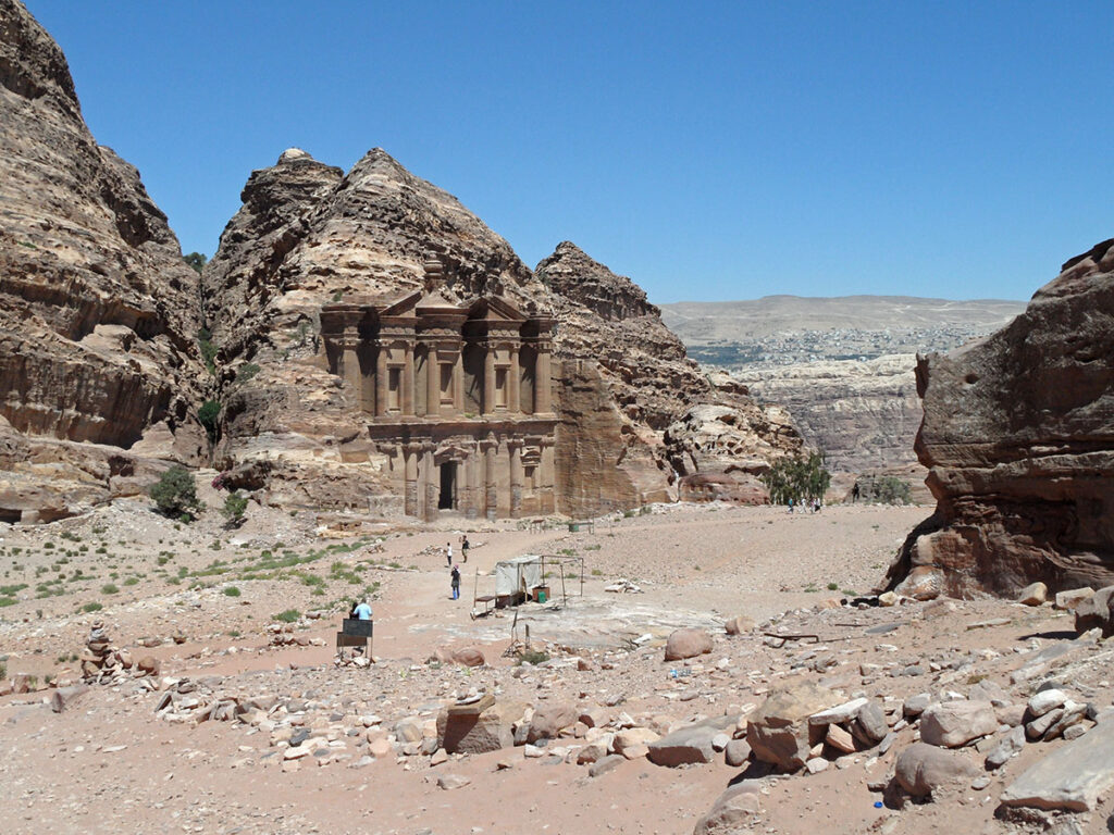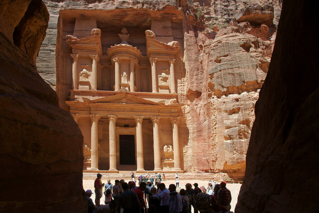 Przy Al Chazanie na chwilę znika magia wąwozu. Tu zaczyna się bliskowschodni chaos, handel i cała komercja tego miejsca. A właściwie, dlaczego ma nam to przeszkadzać? To przecież drugie życie tego miejsca. Przecież tak kiedyś być musiało! – Petra żyła handlem, targowiskami, przyjezdnymi, nawet z najdalszych zakątków cesarstwa. Teraz żyje handlem z przybyszami z najdalszych zakątków globu! Wchodzimy więc do dawnego, żyjącego dziś miasta! Petra rozciąga się na kilkukilometrowej powierzchni, a przybysze mają do dyspozycji kilka szlaków – propozycji poznawania tego miejsca. Dobrze jest mieć na to dwa dni, w jeden trzeba posiąść trudną sztukę rezygnacji i wybrać tylko najważniejsze miejsca. Ząb czasu i pustynne wiatry zostawiły na architekturze Petry nieodwracalne ślady zniszczenia. Mimo to, zachwycone oko co rusz zawiesza się na wyrzeźbionych w kamieniu potężnych fasadach Skarbca, Grobowca Urny, Klasztoru. Fasady płynnie rozpoczynają się i kończą naturalnym kształtem skał, miasto żyło w ich wnętrzach, w naturalny sposób ułożyło swoją topografię w zastanej przestrzeni. Jest tak harmonijnie wpisane w krajobraz, że oddalone budynki wydają się być mirażem pustynnym. Kształt staje się wyraźniejszy przy bliższym poznaniu. Najlepiej wśród tego pejzażu wyglądają tutejsi, odziani w galabije i turbany Beduini.