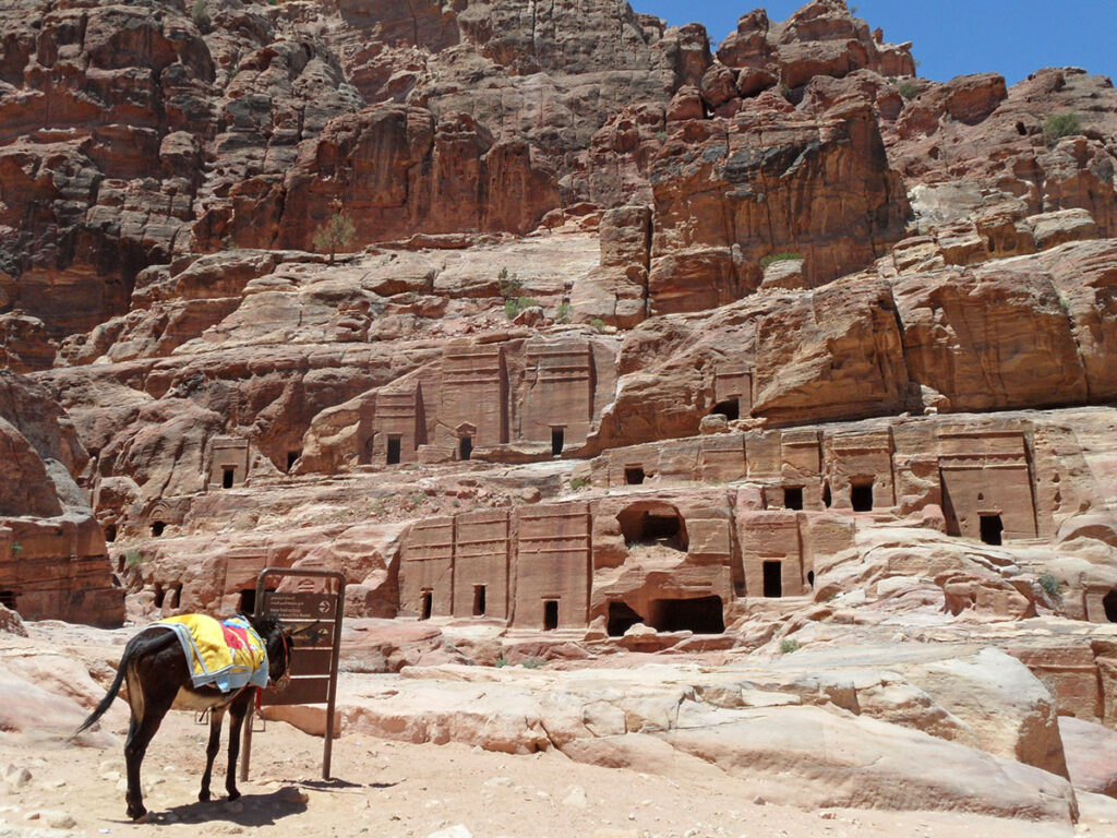 Na głównym szlaku pomiędzy Al Chazanem, a Klasztorem, znajdują się wykute w skale królewskie grobowce – ta część nazywana jest Ścianą Królewską. Najokazalszym spośród budowli jest wspomniany Grobowiec Urny z potężną 26-metrową fasadą z kolumnami. Jest to jedna z niewielu tutejszych budowli, której wnętrze można zwiedzać. Jest jednak puste, a pierwsi odkrywcy Petry nie znaleźli w nim nigdy ludzkich szczątków. W drodze do klasztoru mijamy ulicę Fasad, – w ścianach skał wykute zostały groby Nabatejczyków. Ta ścieżka prowadzi do teatru, powiększonego przez Rzymian, aby mogło w nim zasiąść nawet do 10000 widzów. Ulicami ze szpalerem kolumn ruszamy w stronę świątyni – jedynej wolnostojącej budowli Petry. Warto czymś nakryć głowę, jeśli jest się tu w upalny dzień. Tu, podobnie jak na greckim Akropolu słońce chłoszcze niemiłosiernie. Kierując się w stronę Klasztoru warto na chwilę odpocząć ochłodzić się i dowiedzieć nieco więcej o Petrze w miejscowym muzeum. Do łez rozbawiła nas śpiąca postać portiera. Zmęczony upałem i zaklęty snem tego miasta odpoczywał drzemiąc podczas, gdy my karnie, cichutko, nie przerywając jego snu oglądaliśmy zgromadzone w muzeum fragmenty mozaik, fresków, ozdób. Wyszliśmy niepostrzeżenie, nie budząc demonów przeszłości, dając odpocząć zmęczonemu ciężarem dziejów muzealnikowi 😉