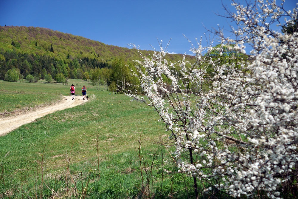 Humus jemy w trójkę. Nie w Tel Avivie, ale w równie miłych okolicznościach, tym razem przyrody, z rozległym widokiem nie na morze, ale na przestrzenie nieograniczone, połemkowskie. Delektujemy się smakiem Bliskiego Wschodu w otoczeniu tutejszego niebytu wschodniej kultury. Nie słuchamy szumu morza, ale muska nam policzki wiatr, głaszcze uszy jego szum. Nie rozpieszcza nas błękit fal, ale zachwyca wielokrotność odcieni zielonego na okolicznych wzniesieniach, biel tarnin i upojny zapach czeremchy – odurza. To jedyne miejsce z takim koktajlem wrażeń, dostępne na dziś. A ukochane nie tylko dziś. Tu i tam słońce ogrzewa nas równie mocno. Dzięki temu nie jest nam aż tak żal… My już tam byliśmy, na Izraelskim Wzgórzu Wiosny w Tel Avivie, ale Edith ma to jeszcze przed sobą, tak ustaliliśmy, wspólne wrażenia izraelskie ciągle przed naszą trójką, nie zabierzesz nam tego po raz drugi, wirusie!