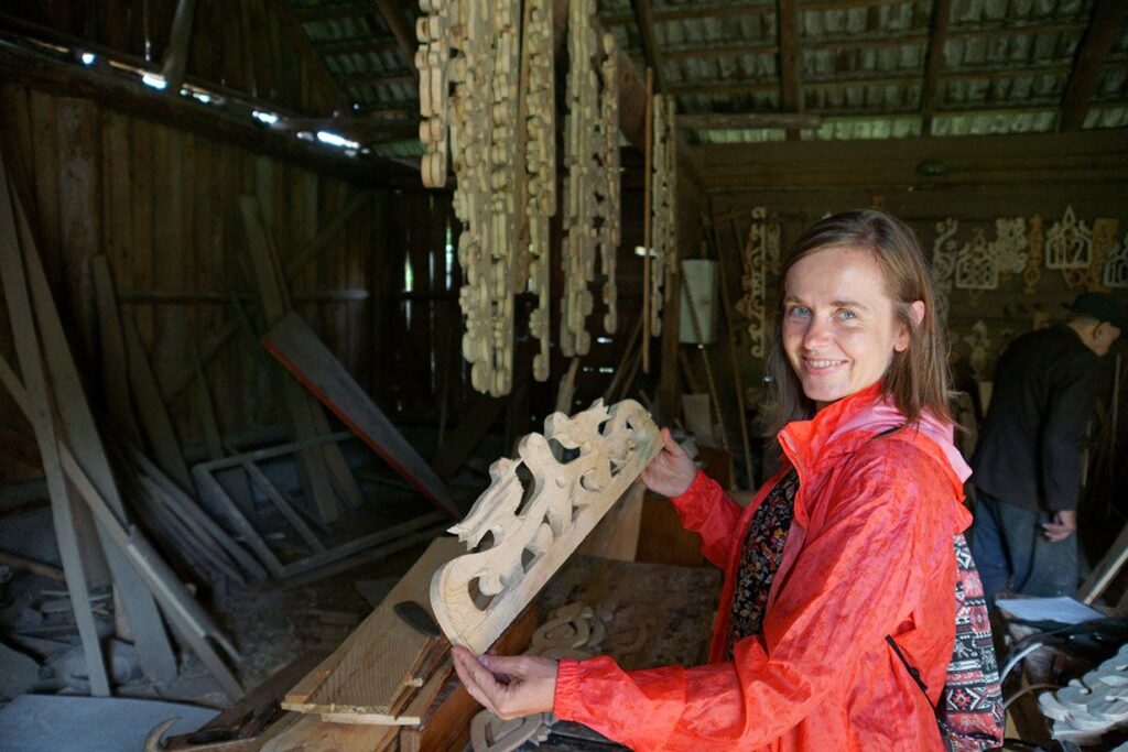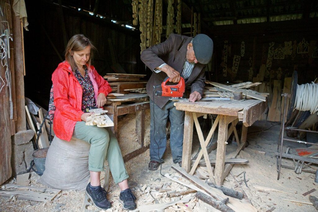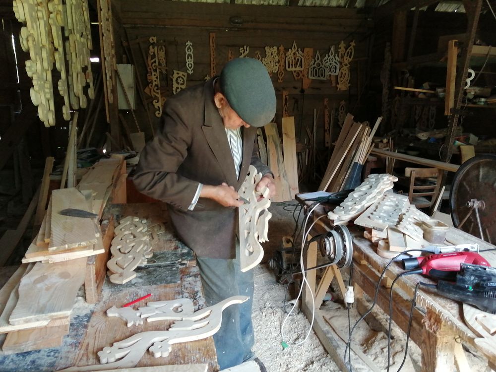 Mówi się tu jęzkiem prostym – gwarą podlaską, będącą mieszanką polskiego, białoruskiego, ukraińskiego. W najczystszym wydaniu słyszymy ja w Wojszkach, oddalonych od powyższej turystycznej trójcy. Niby oficjalnie poza szklakiem Krainy Otwartych Okiennic, ale tak naprawdę, tam dopiero okiennice są szeroko pootwierane, tam uroda domków prezentuje się w pełnej krasie. Nic dziwnego, wieś nosiła w czasie międzywojennym sławę najpiękniejszej nadnarwiańskiej osady. Dziś o jej urodę niestrudzenie dbają ręce i wyobraźnia 91-letniego Aleksieja Ryżyńskiego, miejscowego snycerza, który niemal całe swoje życie wykonuje zdobienia domów dla całej podlaskiej okolicy. Gdzie tam dla podlaskiej! Aleksiej ozdobił już okiennice niejednej podwarszawskiej posiadłości, pomorskiej, podkrakowskiej, a nawet oczarował ptaszkami z serduszkiem cały autobus Chinczyków, których do Wojszek ściągnęła sława tutejszej snycerki, a może woń przyszłego interesu…. Jak tu znaleźć te wprawne ręce, tę wrażliwość, ten 91-letni upór tę miłość do ptaszków i tulipanów? Wojszki, choć kiedyś zamieszkiwało 800. osób, dziś ucichły, jakby zmalały. Przycupnęły przy trakcie do Białegostoku i nie czekają na odkrywców, czekają na koneserów ;-). A Aleksieja znają tu wszyscy. A więc trudno nie było. Krucha i wiekowa żona, stara się wyjaśnić, gdzie znajdziemy podlaski thesaurus, ale dzieli nas gwara, której granice w końcu przecina uśmiech i jasny gest. Stodoła. Zresztą słychać. Pan Aleksiej do turystów przywykł. Chcą ptaszki z serduszkiem? To chętnie zrobi! Spracowana ręka szybkim gestem wycina wzór i dopieszcza kształty, wygładza hardość drewna. Błękitne, nieco zamglone oczy z miłością patrzą na dzieło ręki. W stodole wiszą nadookienniki, podokienniki, numery ciepła rodzinnego, którego pilnują pary uroczych ptaszków. I te na zamówienie, i te które na zaś, i deski, które czekają na kształt. Kury znudzone powtarzalnością tutejszych zdarzeń okupują stół, rozrzucają wióry.