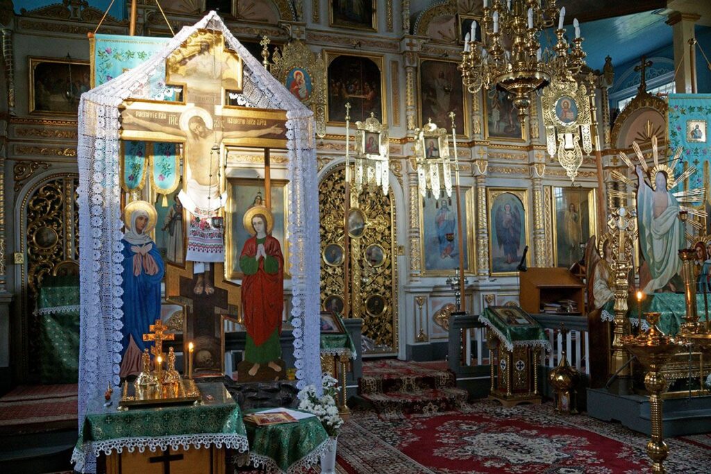 Królową wioski, otoczoną kolorowym światem zdobionych domów, jest zielona cerkiew pod wezwaniem Świętego Michała Archanioła. Zbudowana w XIX wieku, po tym jak spłonęła ta wcześniejsza XVI-wieczna. Na wieży obecnej cerkwi był kiedyś ponoć zegar i ponoć zawsze wskazywał godzinę 9.00, potwierdzając niejako panujący tu wszem i wobec bezczas. Tak więc jako bezużyteczny wobec wieczności, został zlikwidowany. Zarówno teraz , jak i przed rokiem cerkiew w Trześciance zastaliśmy otwartą, powitał nas jej opiekun, niezwykle żywiołowego usposobienia, rozmowny, dowcipny, pełen pasji i pełen wiedzy. Cierpliwie odpowiadający na te same niekończące się przez całe wakacje pytania o różnice. Ciekawe, czy ktoś kiedyś pyta go o podobieństwa? Ostatnich zwiedzających ponaglają wpadające do świątyni promienie zachodzącego słońca, dyskretnie oświetlające krzyże na płaszczenicy. Subtelnie towarzyszy mu światło świecy za umarłych z lewej i za żywych pośrodku. W sobotę wieczór zabrzmi tu śpiew i wtedy ten obraz dopełni się.
