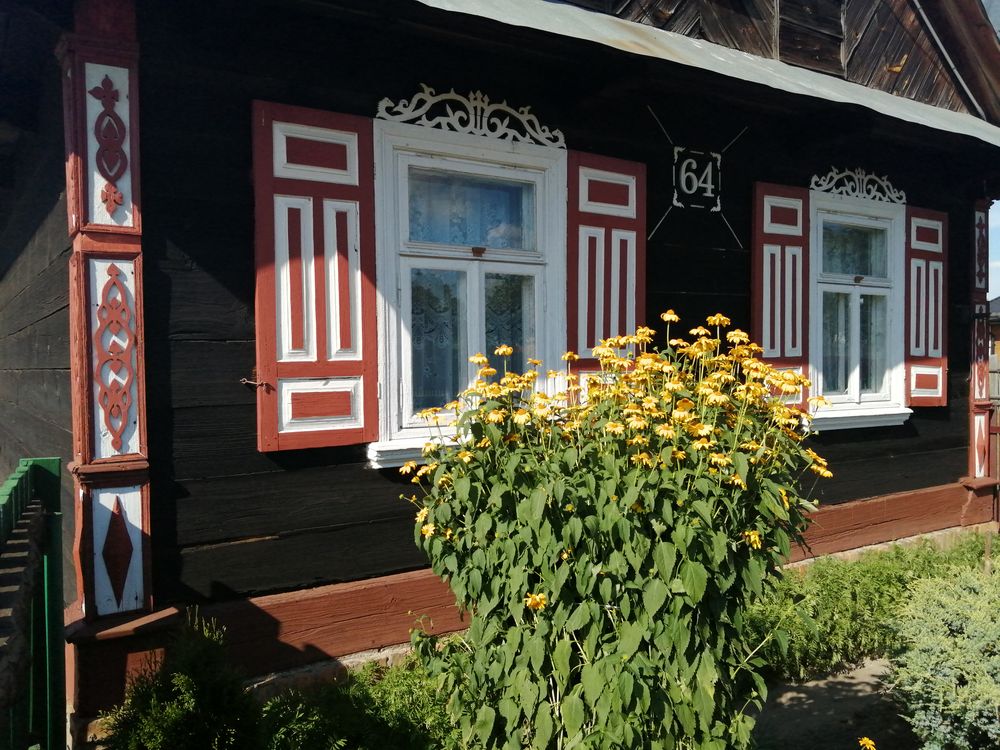 Kolorowe okiennice, ozdobione okna, nadokienniki, podokienniki i narożniki domów, cudeńka snycerki, skradają spojrzenia, więc trzeba się zatrzymać, żeby się nazachwycać. Pandemiczne wakacje sprowadziły tu tych, których oczy zachwycał dotąd błękit afrykańskich wód, chorwackie wodospady, czy zielenie Krety. Nagle wpadają tu w bezczas i słodki jak tutejszy miód spokój, błogość i urodę zdobionych domów. Oto podlaska Krainy Otwartych Okiennic. Od niedawna przybywają tu ciekawscy i znudzeni, łaknący orientu, odkrywcy, turyści pandemiczni. I w zadziwieniu stają w biegu, oniemiali, że to wszystko tu jest. Te zielenie, te błękity, to palące słońce i orient i egzotyka. Odkrywają i smakują Podlasie wielowątkowe, nabrzmiałe innością. Trześcianka, Puchły i Soce zmówiły się jak panny na wydaniu i prezentują swe wdzięki jako pierwsze, najsłynniejsze. No bo te zdobienia, te koronki, w które ubrane są domy tutejsze, te ptaszki, słoneczka, roślinki, na kolorowych jaskrawych tłach w otoczeniu latem kwitnących kwiatów, śmiejące się do przybysza gościnnością, otwartych okiennic, to właśnie tu.
