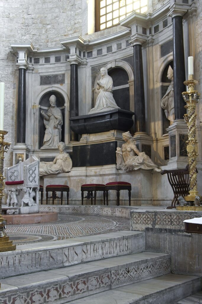Pogoda ducha, radość i dobro w jakie niebiosa wyposażyły świętego Mikołaja unoszą się nad Bari (być może unoszą się w nas), gdzie ci nożownicy?… Czy oprócz tego wyjątkowego miejsca to miasto jeszcze czymś może nas obdarzyć? Jego długa i niezwykła historia – najpierw osady zwanej Barium, która od VI do X wieku była najpotężniejszym portem południowo-wschodnich Włoszech, podbitej przez Normanów, którzy zbudowali tu potężną twierdzę przebudowaną i wzmocnioną przez króla Sycylii Fryderyka II, widoczna jest i potężnych murach Fortino o nieco renesansowej bryle i w murach pięknej XII-wiecznej gotycko-normańskiej katedry św. Sabina – pierwszego patrona Bari, której, której sławę i znaczenie odebrała bazylika świętego Mikołaja. Mówią o niej także zaułki i słynne podwórka Civita Vecchia, które być może złą sławę zawdzięczały powojennej biedzie i zaniedbaniu, trwającym uporczywie i ciągle jeszcze widocznym. Dziś spokojne, wręcz uśpione późną nocną godziną, migające blaskiem wiecznych lampek z niezliczonych ołtarzyków maryjnych, mikołajowych, malowniczo odrapane, staje się niezwykle pociągające, tajemnicze i wręcz egzotyczne.