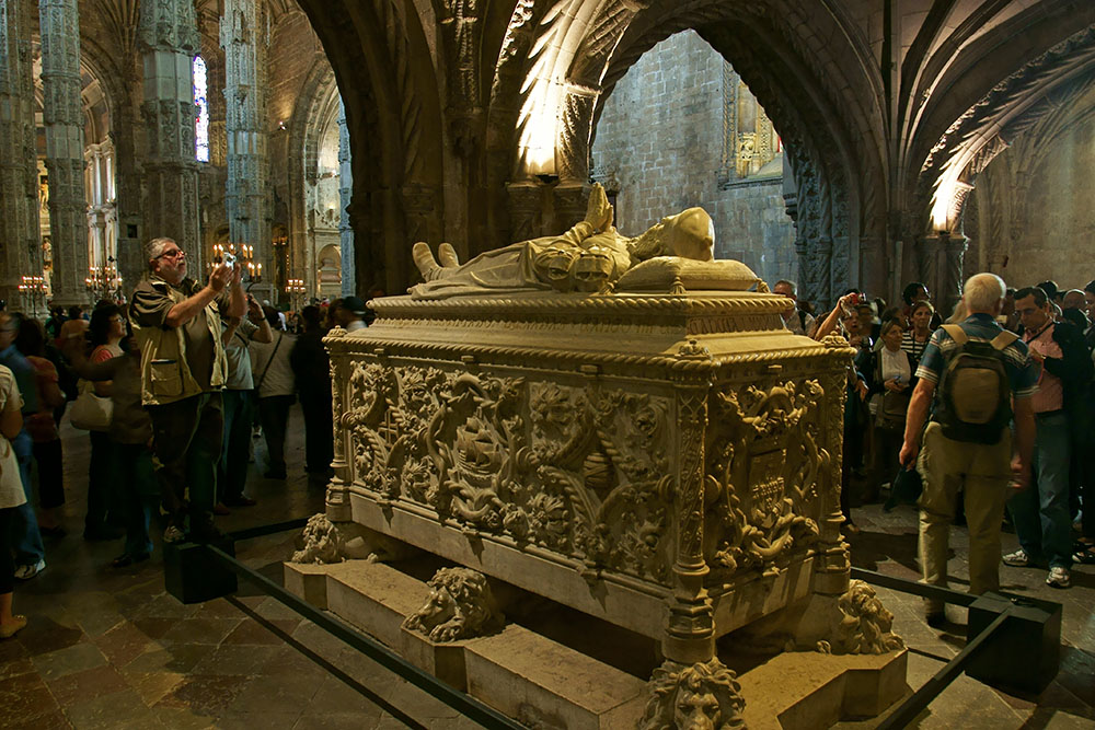 Imponujące są,wykonane w kamieniu, koronkowe zdobienia, skamieniałe liny okrętowe, przeplatające wieżyczki . Trudno oderwać wzrok od uśpionej sylwetki samego wielkiego Vasco da Gammy. Jego nagrobek zdobią motywy roślinne, wspomniane liny okrętowe i sam okręt przypominjący kim był ten postawny, odważny, obdarzony intuicją, talentem, wiedzą i jakimś rodzajem brawury czy wizjonerstwa żeglarz, który śpi snem wiecznym, tuż przy wejściu. Sąsiaduje z nim jedengo z największych portugalskich poetów-Luísa de Camões. Grób Vasco przeniesiono do Belem w XIX wieku i z tego okresu pochodzi nagrobek autorstwa Costy Mota.