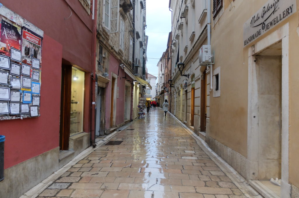 Jakież deszczowe było to pierwsze nasze spotkanie. Zadar w strugach deszczu! Morze zszyte z niebem, i błyszczące deszczem kamienne chodniki, tak to zapamiętam 😉 To może wydawać się niepojęte każdemu, kto odwiedził ten zakątek Europy, w rozsłonecznione wakacyjne miesiące. Dlatego tęskniąc za takim właśnie obliczem miasta zjawiłam się w progach Zadaru także pół roku później – w październiku. I co powiem? Że było warto i wtedy i wtedy.